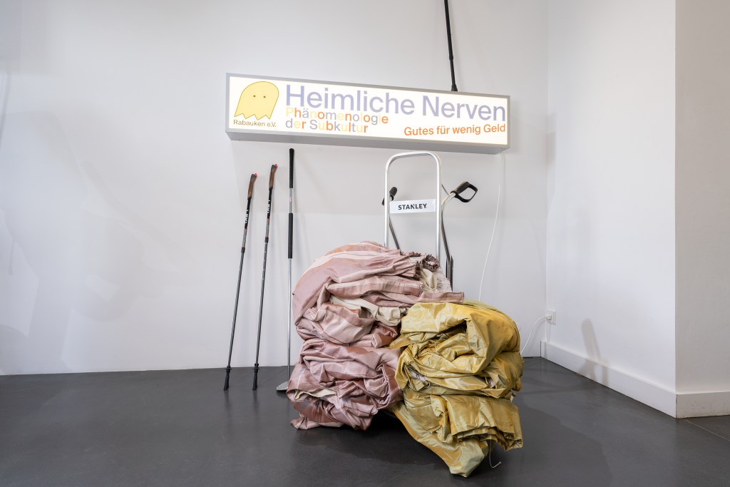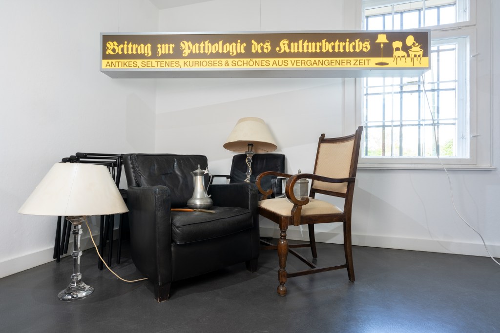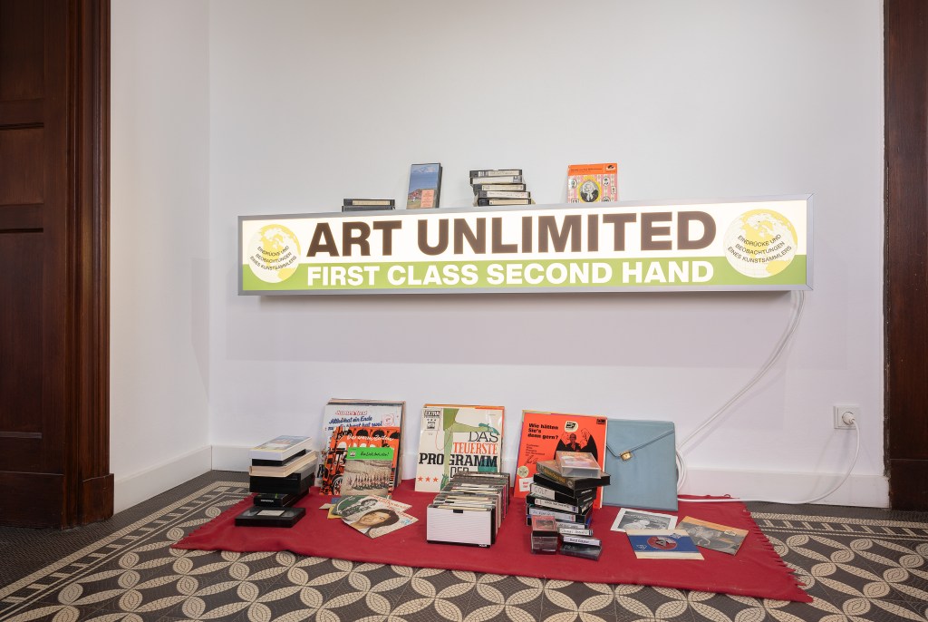 The artist commissioned Rümpelwelt, a household clearance company, to transport the remaining objects to be cleared from Harald and Larissa Falckenberg’s apartment in Hamburg to Potsdam. Rümpelwelt then sorted the objects according to their future destination—used bookstore, donations, recycling center, and so on—and arranged them in the exhibition space. Light boxes complement these groups of objects and echo the aesthetic and style of junk stores. Advertising slogans are interwoven with Falckenberg’s text headings.