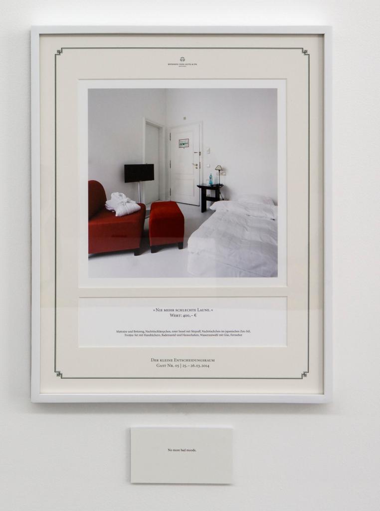 A basic aspect of a hotel is that it provides an established setting into which guests temporarily assimilate themselves to create a home for a limited period of time. Christian Jankowski draws on this situation and transforms a classic hotel room into a space of possibility. Within the opulently furnished halls and hallways of the Brenners Park-Hotel & Spa in Baden-Baden, the door to Room 127 leads to an open, empty space within an operation that is otherwise fully structured, down to every last detail. In this bare room with glaringly white walls that recall the »white cube« of an exhibition space, guests are presented with the option of furnishing the room to meet their demands. From the standard to the opulent, the furnishings of the room can be compiled from a catalogue according to a building-block concept. However, the idea is not merely to put together the most beautiful or cozy room decor. It offers a place of refuge that requires guests in this situation to make an important decision on their own accord—whereby the more weighty the decision becomes, the more the artistic »value« of the overnight experience increases. With his work created for the Brenners Park-Hotel & Spa in Baden-Baden Jankowski questions the meaning of material luxury—and each guest is presented with the ques-tion as to his or her own need for representative display. Also, the guests’ decisions do not remain hidden behind the closed door of Room 127 but are documented in pho-tographs on a daily basis and shown publicly. Ultimately, as the creator of his or her individual little rooms for decision, each guest produces what amounts to a self-portrait—by using the scope of possibilities presented by the artist.