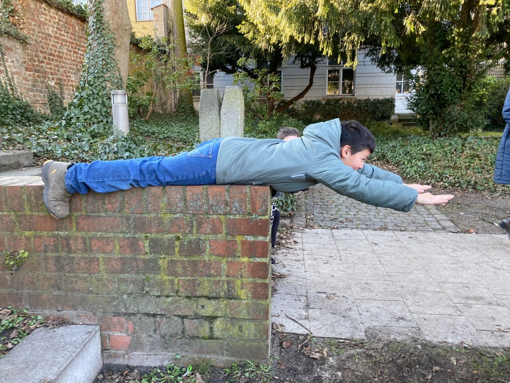 In the first stage Jankowski takes the children on a walk where they were asked to change their status from human to object. In a performative act they freeze in poses representing stairs, benches, gates and other objects of their choice. These situations were photographed and taken as starting points for discussions in the classroom.