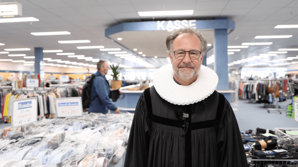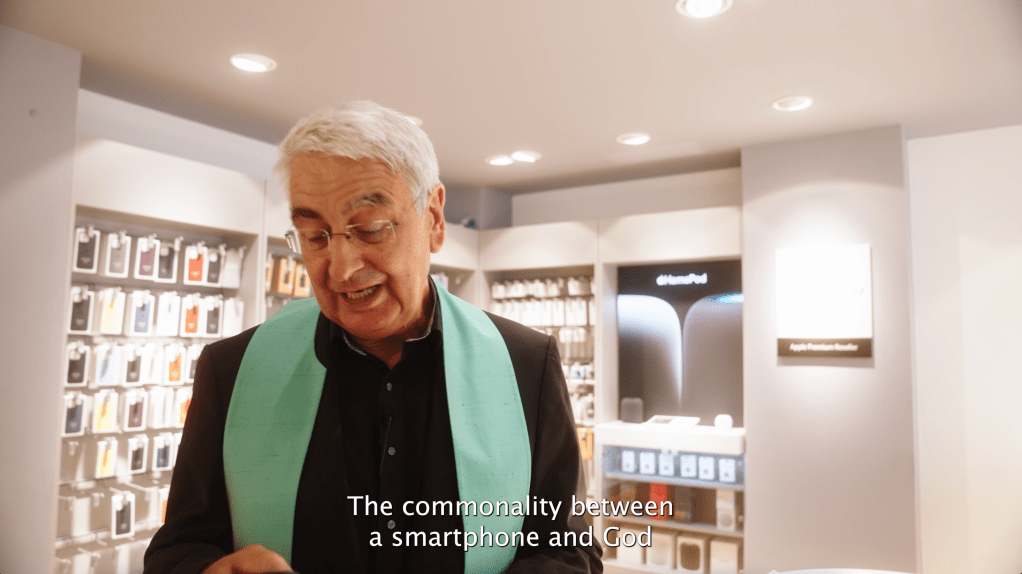 Pastor Schwarze – Furniture Store Pastor Pfeifer – ClubPastor Akkermann – Supermarket Video Still of Pastor Jedeck in the Apple Store Pastor Gauer – Holtex Heilige Geschaefte Part I – Exhibition from Christian Jankowski in the Overbeck Gesellschaft Lübeck 2023 Installation View