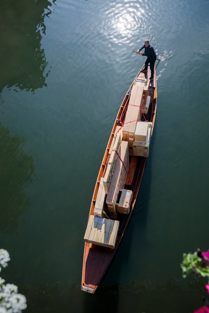 Installation: punting barge, labeled transport boxes, 250 × 1000 × 160 cm