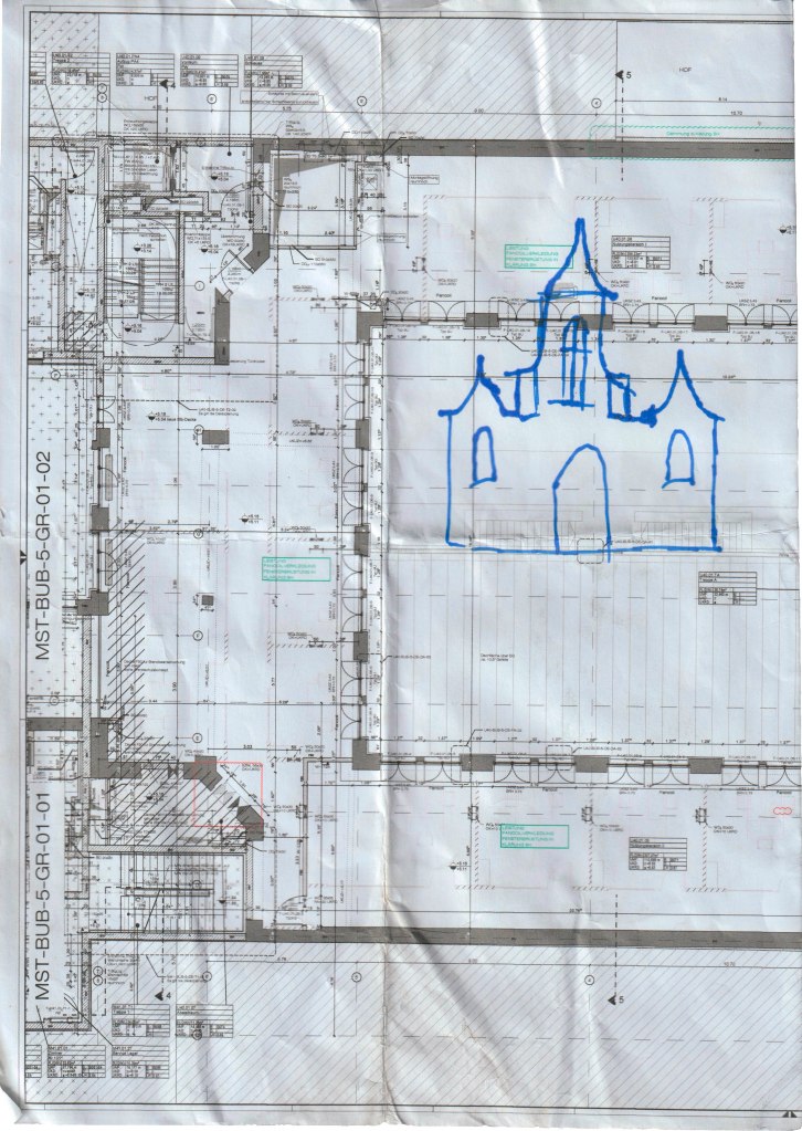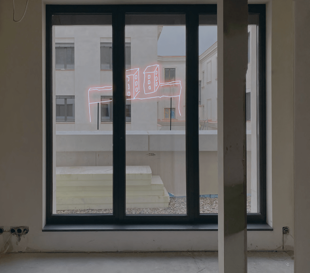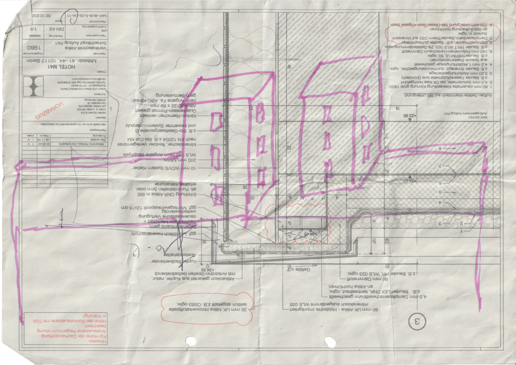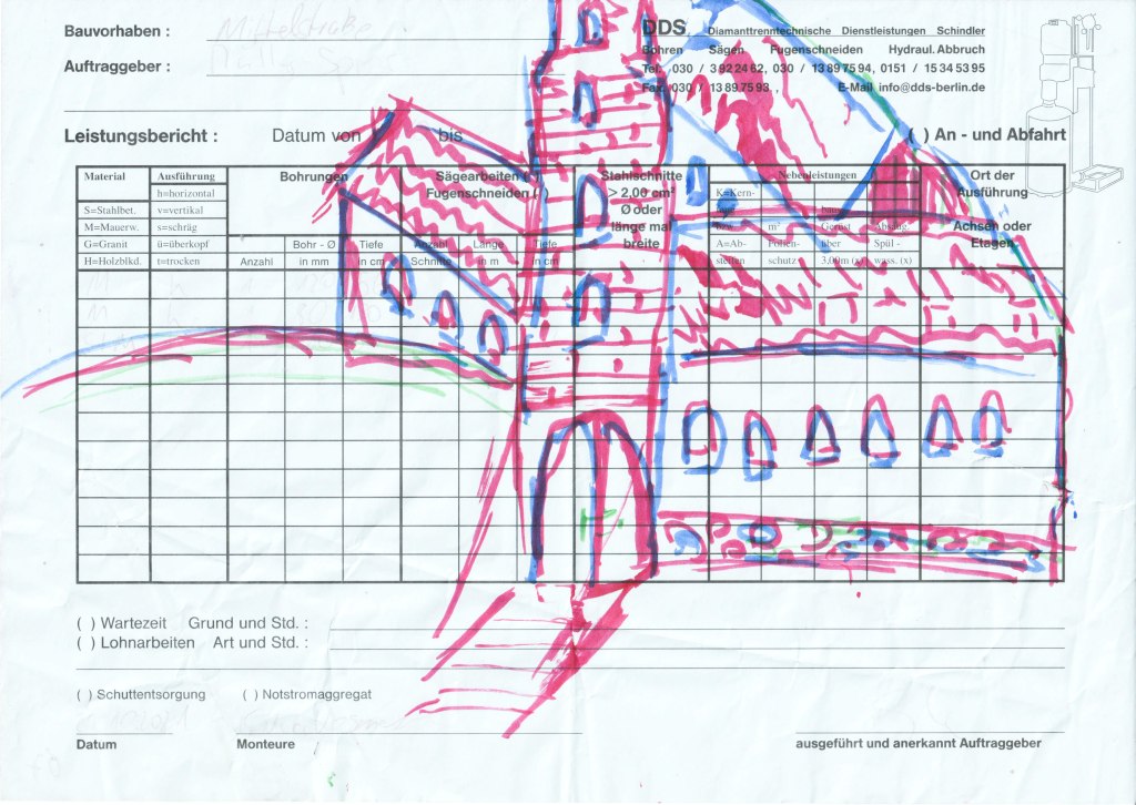 A little way down Unter den Linden, Jankowski asked the construction crew working on the new Château Royal hotel, also a partial reconstruction of a historic building, to take a break and draw an imaginary castle. They made their drawings on architectural plans found on site: colourful marks appear over coffee stains and technical outlines of plumbing and electrical systems. Of these, one was realized as a neon sculpture. Installed on a balcony overlooking the hotel’s internal courtyard, at night it seems to float, opening a dialogue with the surrounding cityscape. Enlarged and illuminated, Jankowski’s treatment of the untrained sketch refers to the glorification of the working class in the time of the erased Palast der Republik. Additionally, he addresses the class system within architecture through the payment terms for each participant: they were paid for their time according to their usual hourly rate, but whenever a castle is acquired as an artwork, the sketcher receives a percentage of the sale, much like an architect’s fee.