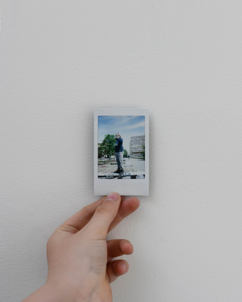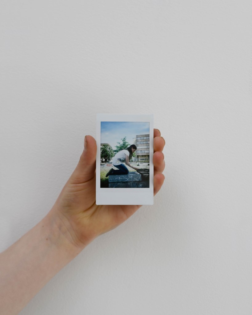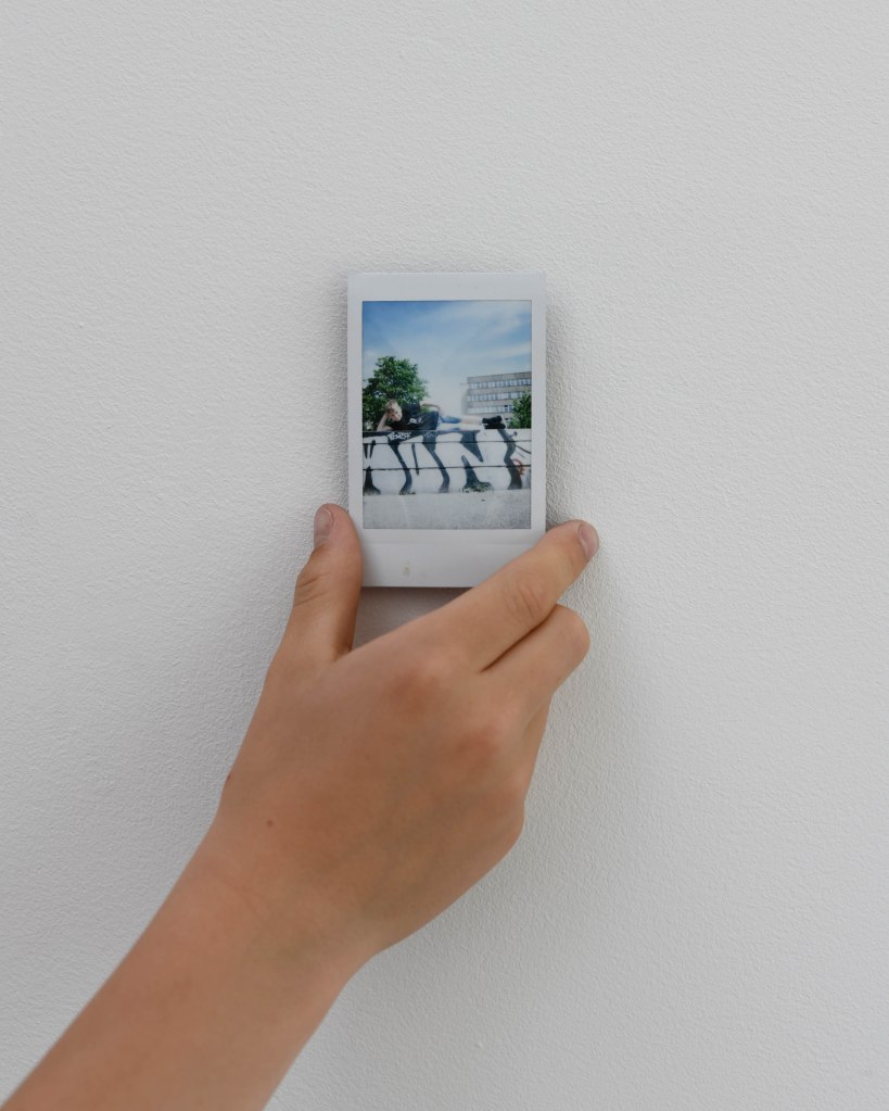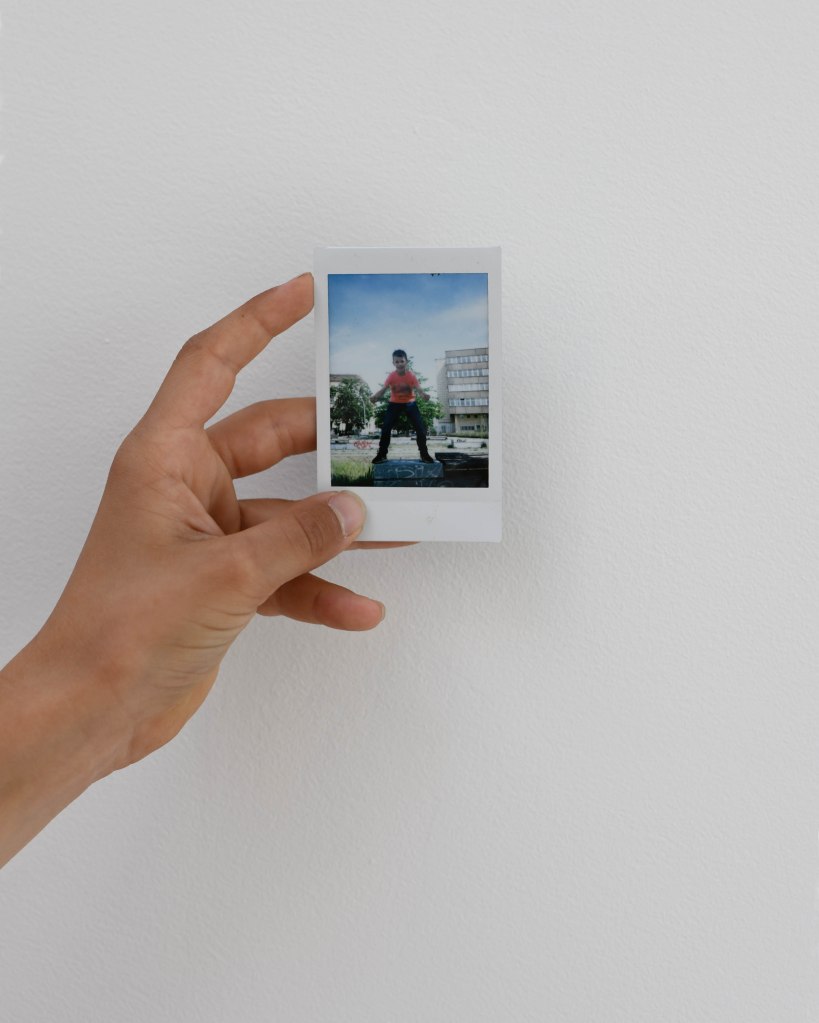 For example, one young boy stood upon the plinth holding the motionless pose of a fisherman to represent time and activity spent with his father. Another, knelt upon her knees reaching forward tenderly and called it ‘A Monument for the Rescue of a Butterfly’. While others pulled the poses of their favorite Manga characters, painters and goalkeepers. These were documented using Polaroid photography which were then returned to the authors hands to create the final works, a series of 7 framed photographs in which you see the hand of a child raising the photograph of their respective performative sculpture against the background of a white wall.