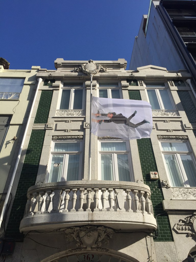 The work Weather Flag was made in the context of Seeing Artists Voices, a project curated by Miguel von Hafe Pérez. For this project, several artists were invited to create a personal flag that would then be hung on a private or public building around the city of Porto, Portugal. Jankowski‘s flag depicts the artist himself hanging in the air while holding onto the curator‘s feet. For now, above the city, both the artist and the curator‘s feet go where the wind blows.
