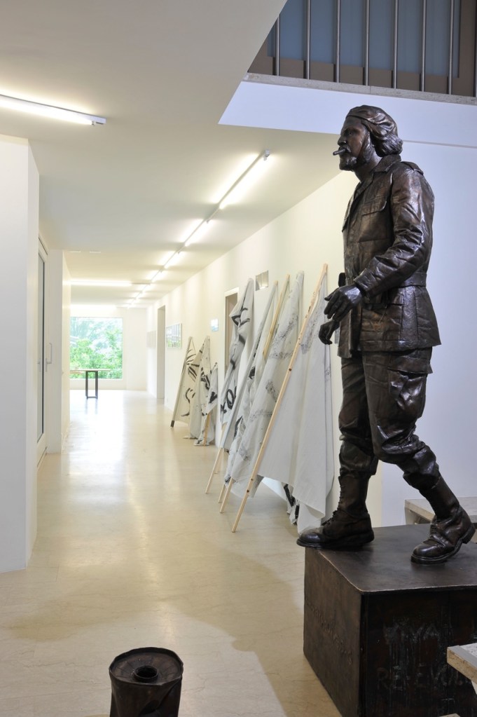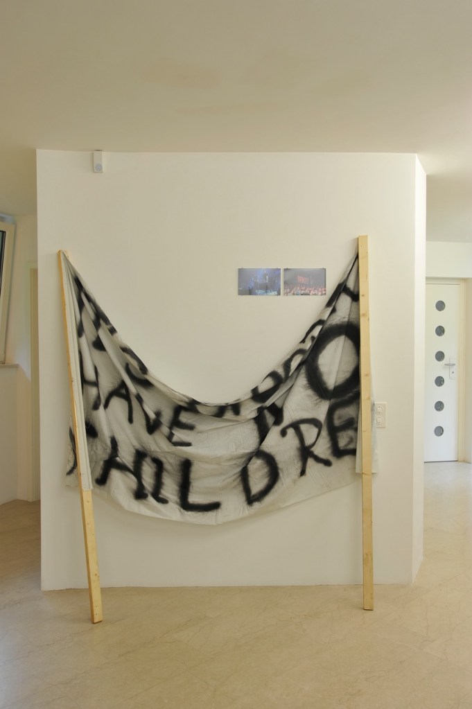 9 banners with text, fabric, dimensions variable, each accompanied by 2 c-prints, each 13 x 18 cm, unique