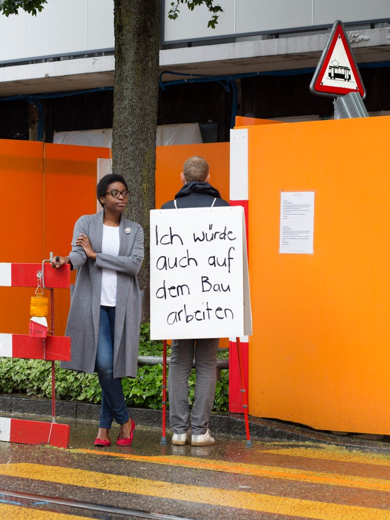 A series of 43 color photographs show Jankowski as ‘sandwich-man’ in the streets of Zurich. The board on his front states the question “what people do for money” while people on the street were invited to write their individual answers onto the board on his back. The photo series thereby forms a mosaic reflecting people´s relationship with money and work–topics that shape all human lives, not only those from one of the world´s principle financial centres. What People do for Money is also the title of the Manifesta Biennial curated by Jankowski in Zurich in the summer of 2016. In addition Jankowski collaborated with the Swiss based magazine Das Magazin, overseeing concept and design for the issue that was published simultaneously to the Manifesta Biennial and dedicated entirely to Jankowski’s project.