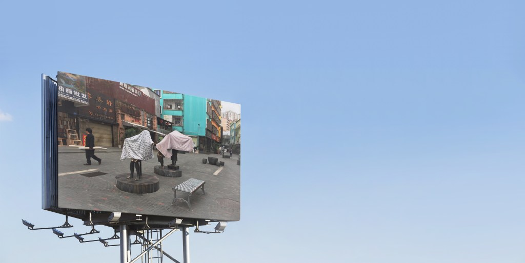 During a trip to the art village of Dafen, China, in order to work with painters onNeue Malerei, Jankowski came across two public sculptures that were being used as drying racks. Struck by the deadpan and pragmatic appropriation of the monuments, Jankowski took a photograph. The enlarged photograph is displayed on a billboard at the entrance to the gallery, facing the street, and with neon lights that illuminate the image at night. This intriguing imagine invites the public to imagine what’s beneath the laundry, and hints at the audience participation within the exhibition.